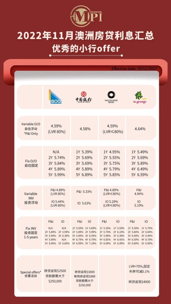 套餐产品 Bank of China的4.58% 麦考瑞银行的4.59%, 对于贷款额度不高的申请人都是很好的选择。