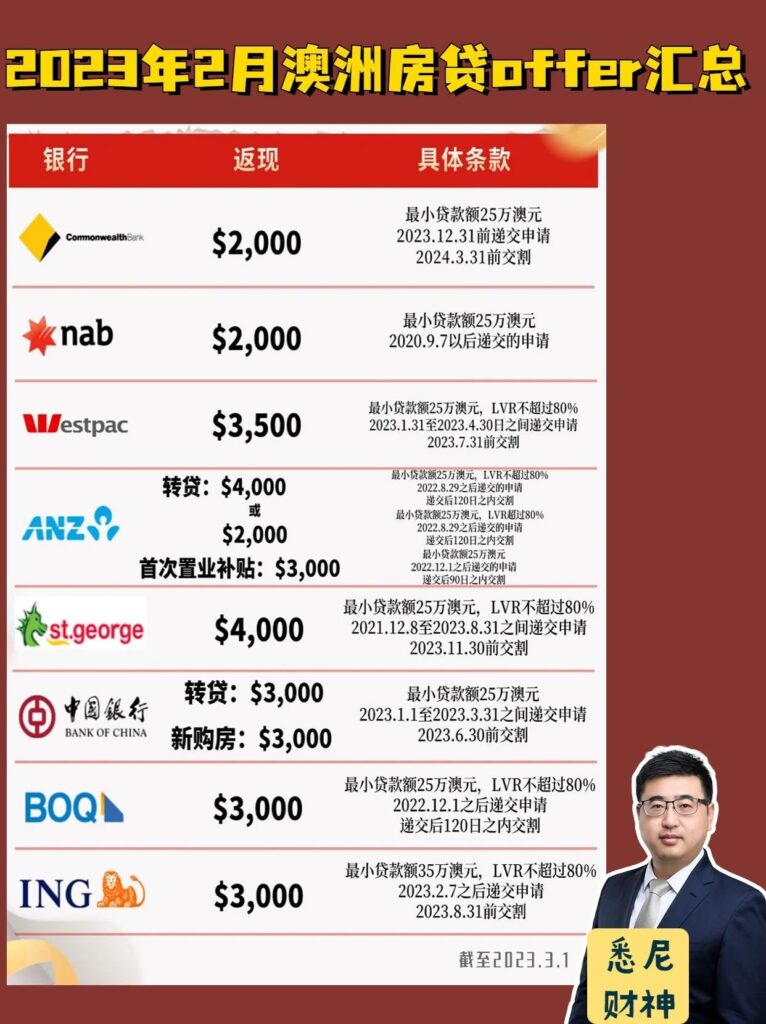 St George Bank 和 ANZ 还是可以拿到4000澳币的补贴,其他银行2000-3000不等。
