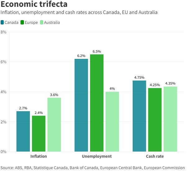 Ray White首席经济学家Nerida Conisbee表示,加拿大和欧洲国家已经开始了宽松周期,尽管其峰值远高于澳洲的4.35%,而且他们目前的失业率非常高,通胀数据较低。